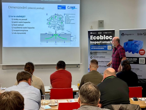 Na projekční praxi navázaly také technické příspěvky společnosti Aquanix. Jan Paulus představil postupy návrhu vsakovacích a retenčních objektů včetně využití projekčních kalkulátorů. Ing. Ondřej Samek se věnoval tématu akumulace a využití srážkové vody, návrhu dešťových a požárních nádrží, filtraci a zkušenostem z realizovaných projektů.