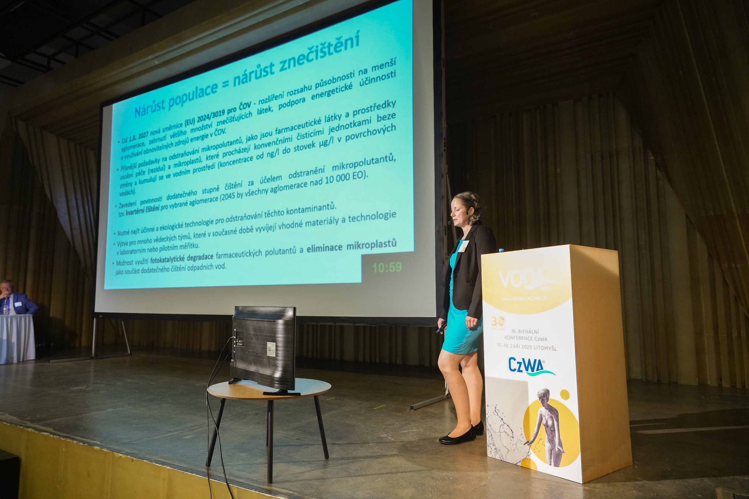 V plenární sekci se dále hovořilo o cizorodých sloučeninách v životním prostředí, o možnostech měření škodlivin, o analytických metodách i vodohospodářském řešení už v zadání projektů. Stejné téma se objevovalo i v dalších sekcích, v ostatních sálech zámku, kde byly standardní sekce dále rozděleny na mnoho dalších témat (namátkou třeba Dešťové vody, Vodárenství, Venkov a přírodní ČOV; Cirkularita ve vodním hospodářství; Modrozelená infrastruktura a další). Nabídka byla opravdu velmi široká, a to včetně takzvané bleskové sekce nabité obsahem s četnými diskusemi, výstavami a postery. Do osvědčeného formátu konference již neodmyslitelně patří hlavní panelová diskuze na průřezové téma. Letos to byla Voda 2050 – Odolné zdroje pro bezpečné zásobování vodou [2].
