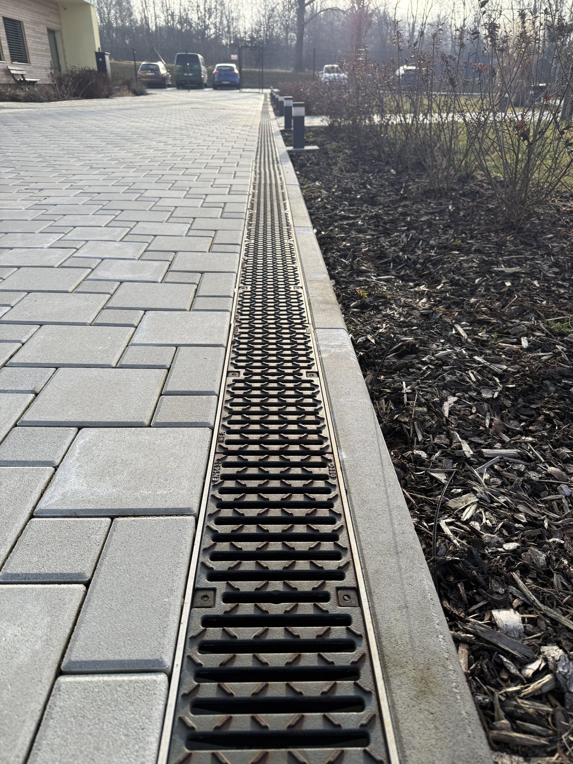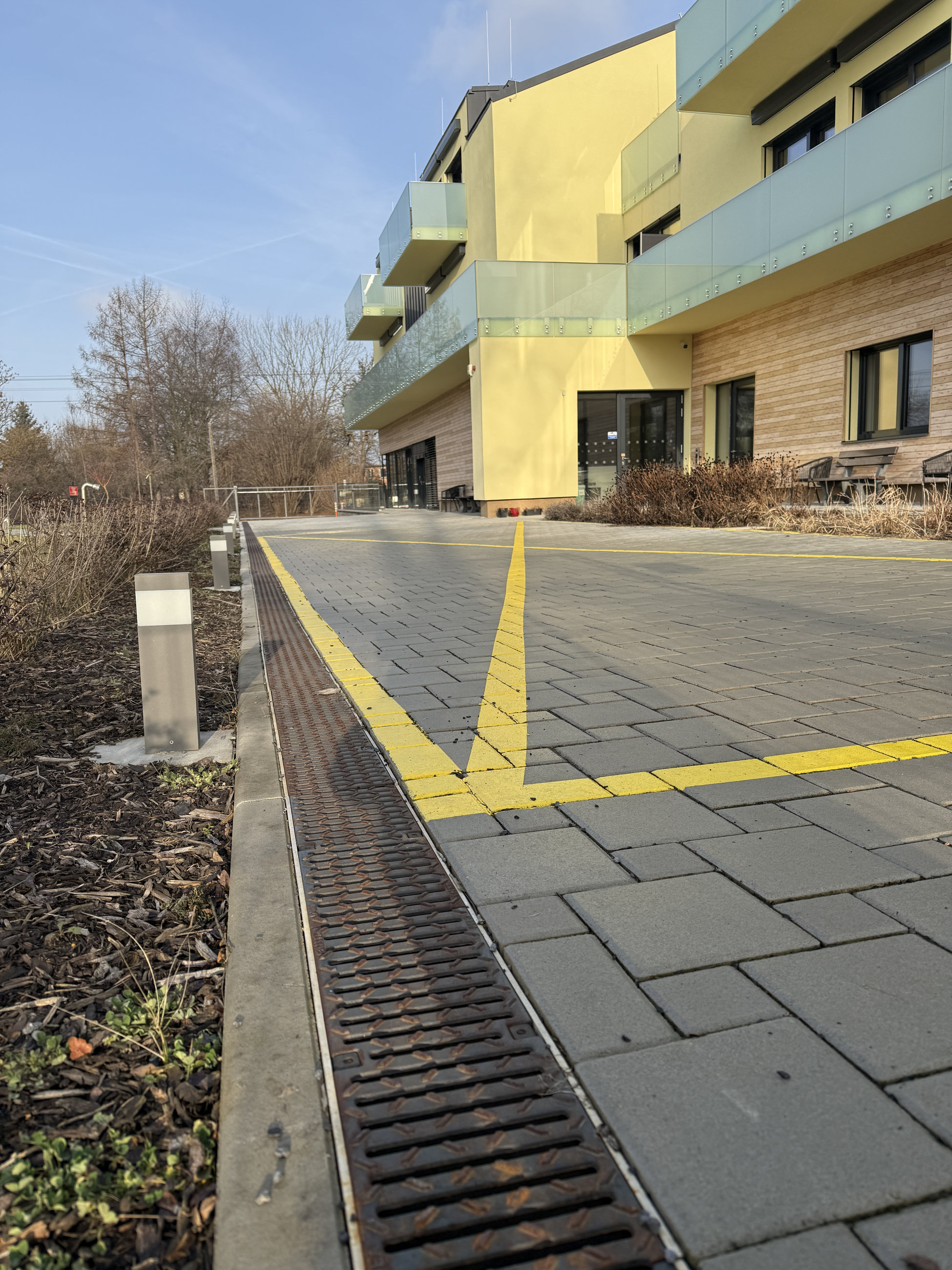 Pro řešení odvodnění zpevněných ploch v okolí budovy byly použity odvodňovací žlaby systému MEADRAIN EN z polymerického betonu, které jsou navrženy tak, aby bezpečně odváděly dešťovou vodu i v místech s vyšším zatížením.