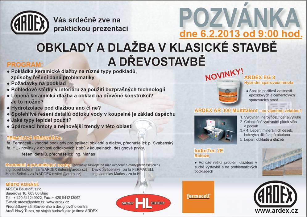 Ve středu 6. února 2013 od 9.00 organizuje firma ARDEX Baustoff v prostorách přednáškového sálu Stavebního a designového centra Brno (areál Nový Tuzex) praktickou prezentaci na téma Obklady a dlažba v klasické stavbě a dřevostavbě. Prezentace se zúčastní také zástupci společnosti Fermacell a HL.