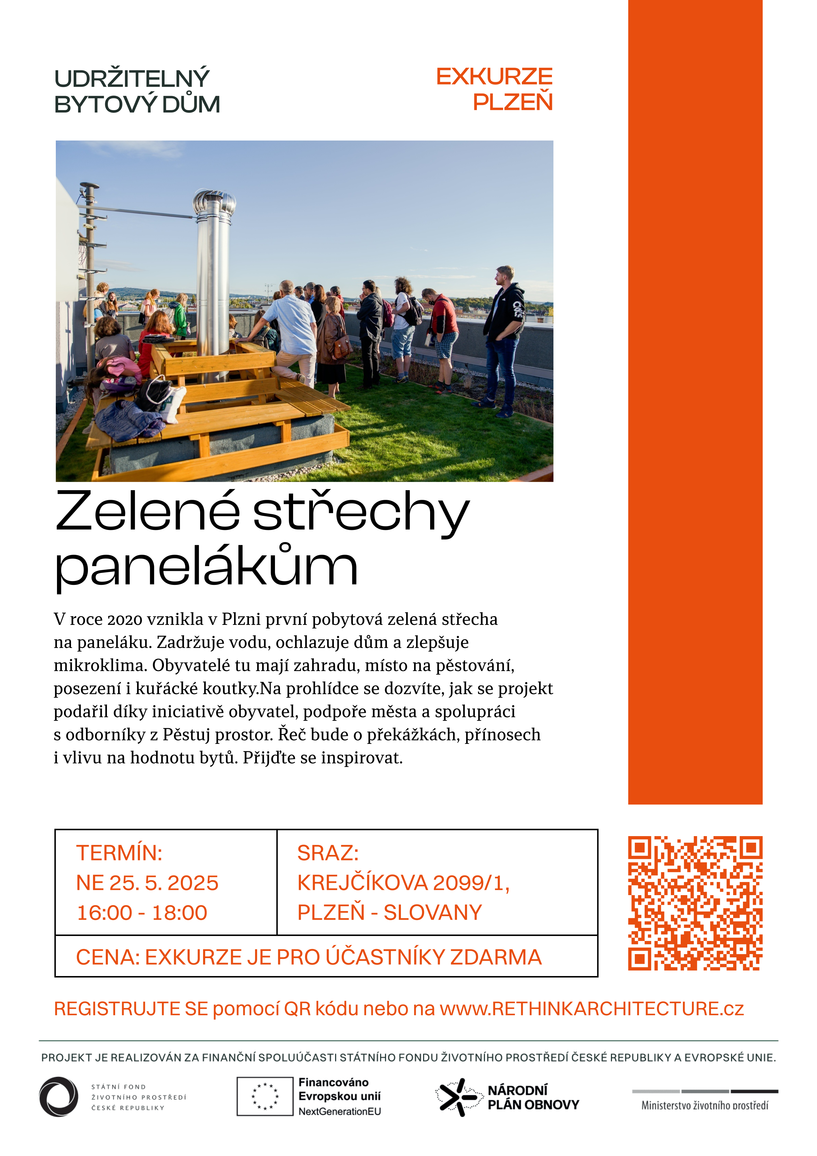 Na panelovém domě v Plzni vznikla v roce 2020 první pobytová zelená střecha. Zadržuje vodu, snižuje přehřívání domu a zlepšuje mikroklima. Obyvatelé tu mají zahradu s možností pěstování, posezení, pískoviště i sušáky na prádlo. Přijďte se podívat na komentovanou prohlídku 25. 5. 2025 v Plzni.