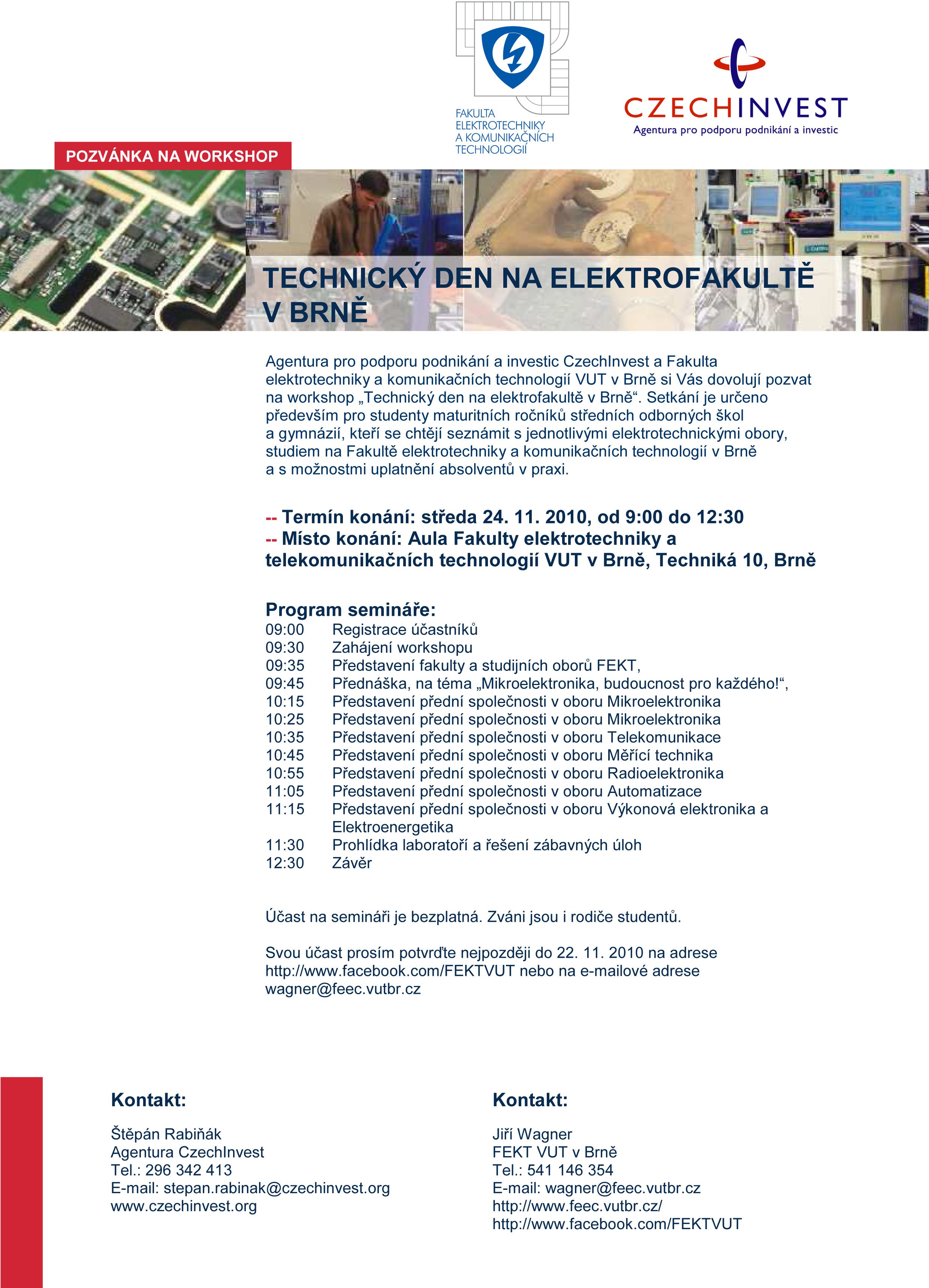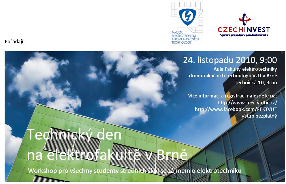 Setkání je určeno především pro studenty maturitních ročníků středních odborných škol a gymnázií, kteří se chtějí seznámit s jednotlivými elektrotechnickými obory, studiem na Fakultě elektrotechniky a komunikačních technologií v Brně a s možnostmi uplatnění absolventů v praxi. Zváni jsou i rodiče studentů. Svou účast prosím potvrďte nejpozději do 22. 11. 2010 na adrese http://www.facebook.com/FEKTVUT