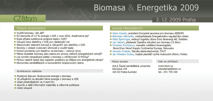 Mezinárodní konference věnovaná biomase, energetice, obnovitelným zdrojům energie, biopalivům, bioplynovým stanicím a souvisejícím tématům. Konference nabídne panelovou diskuzi o budoucnosti energie z biomasy, 16 příspěvků na aktuální téma energie z biomasy a OZE a účast přednášejících ze 4 zemí EU. | ||||||||||