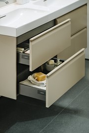 Kolekce MEDA nabízí stylové umyvadlové i závěsné skříňky. Lze je pořídit v nejrůznějším provedení a velikostech, takže je snadno přizpůsobíte své koupelně a individuálním potřebám. Poskytnou dostatek místa pro hygienické potřeby, ručníky, ale i další pomůcky. Zaujmou integrovaným madlem se specifickým tvarováním pro pohodlné otevírání. Zásuvky jsou vybaveny zpomaleným zavíráním.