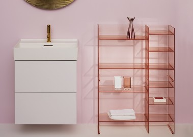 Minimalistická kolekce Kartell nabízí nejenom umyvadlové a závěsné skříňky, ale také regály, ve kterých budou koupelnové potřeby vždy na dosah. Vyrobené jsou z odolného plastu, který perfektně odolá náročnému koupelnovému prostředí. Zároveň se snadno udržují čisté. Zakoupit je lze v nejrůznějších barvách, například pudrově růžové, smoky grey, ale i transparentní variantě.