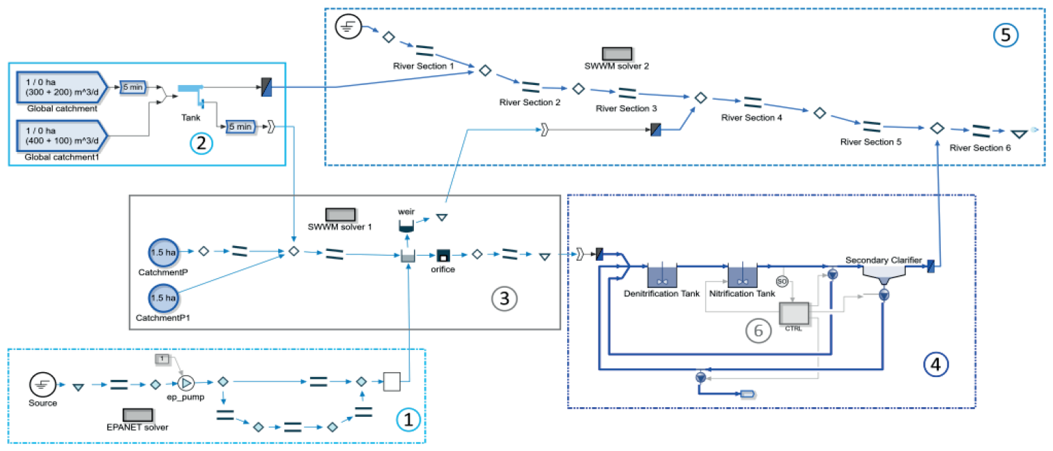 Obr. 1: Příklad integrovaného modelu v SIMBA# s paralelní simulací subsystémů s příslušnými speciálními řešiči (tlaková vodovodní síť (1), povodí (2), kanalizační síť (3), čistírna odpadních vod (4), řeka (5), automatizační funkce (6))