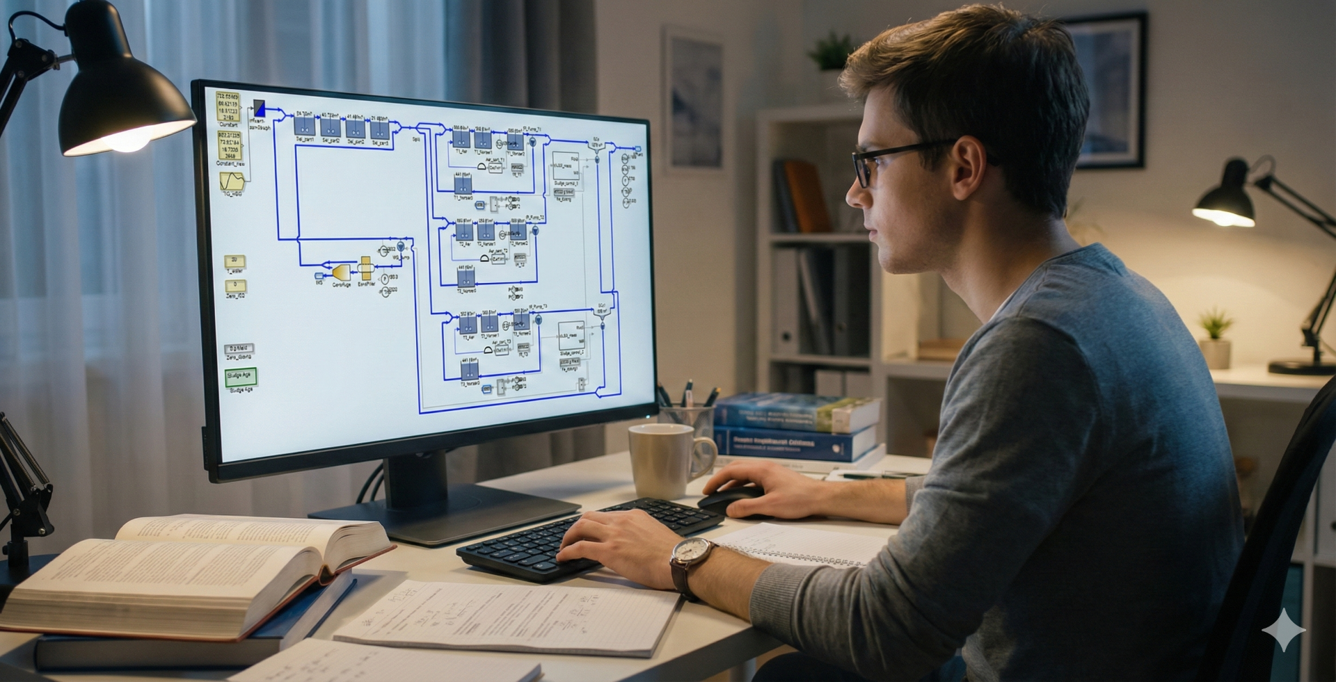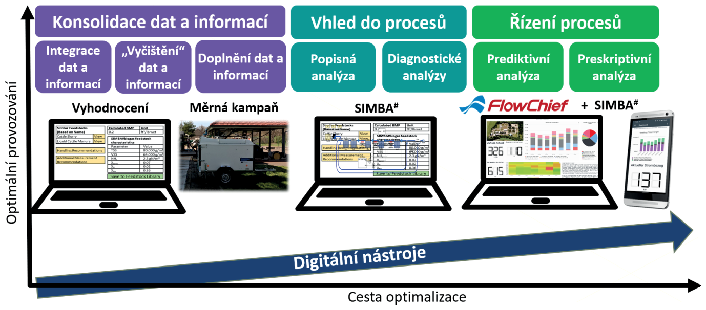 Software SIMBA# představuje univerzální simulační systém pro dynamické modelování technologií ve vodním hospodářství. Integruje potřebné detailní modely procesů i řídicích prvků. SIMBA# se v praxi využívá k navrhování i ke každodenní optimalizaci v rámci provozování (využití jako součást digitálních dvojčat ČOV), kdy model běží paralelně s reálnou čistírnou a pomáhá testovat zásahy či ladit řízení – viz obr. 2: