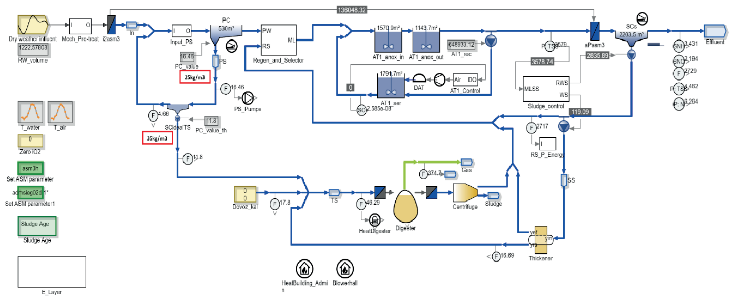 1. Na základě zjištěných informací o celé ČOV, včetně provozních údajů a dalších informací vyplývajících z analýzy nátoků z kanalizační soustavy (včetně i vlivu srážek) je zpracován základní hydraulický a technologický model ČOV – viz obr. 4: