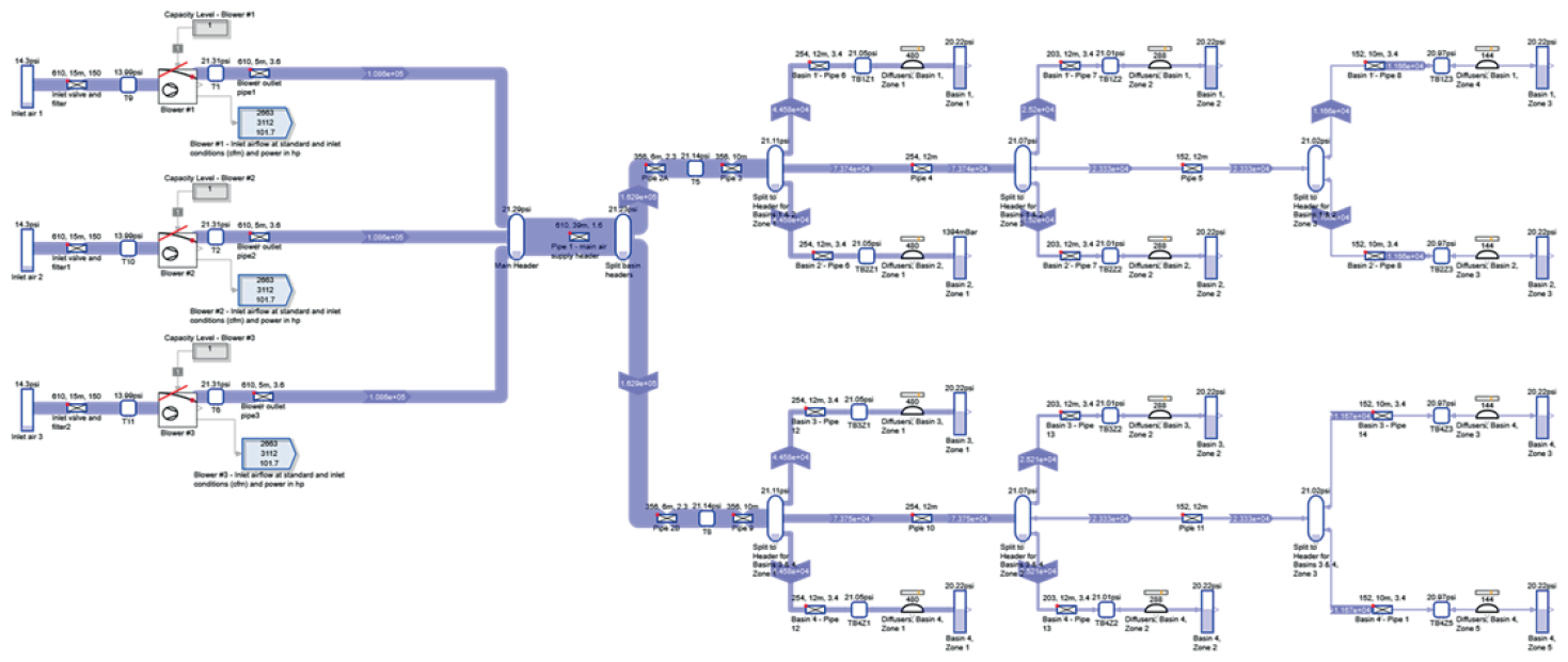 Obr. 5: Příklad dílčí části modelu aeračního systému ČOV