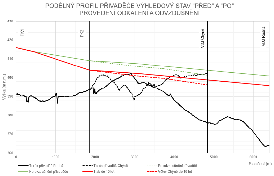 Obrázek 2. Podélný profil přivaděče před a po odvzdušnění přivaděče