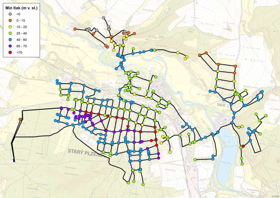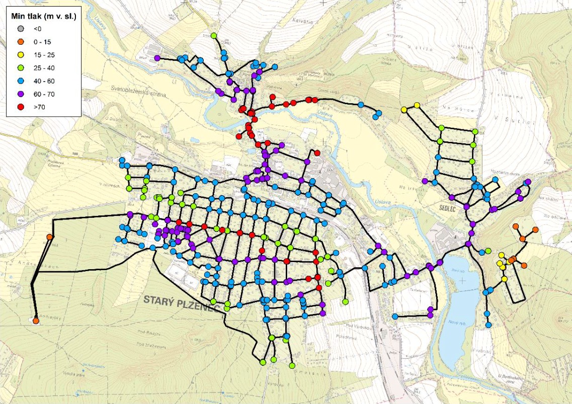 V rámci zpracování posouzení byl na základě provedené měrné kampaně sestaven kalibrovaný matematický model, který potvrdil provozovatelem indikované nevyhovující tlakové poměry v odběrových špičkách. Tato skutečnost je znázorněna na obrázku 3 zobrazujícím minimální tlaky právě při odběrových špičkách.