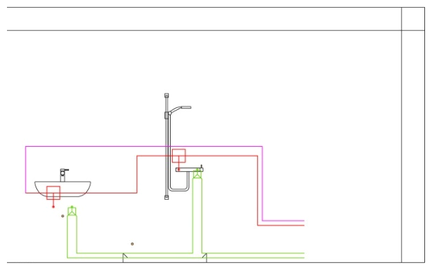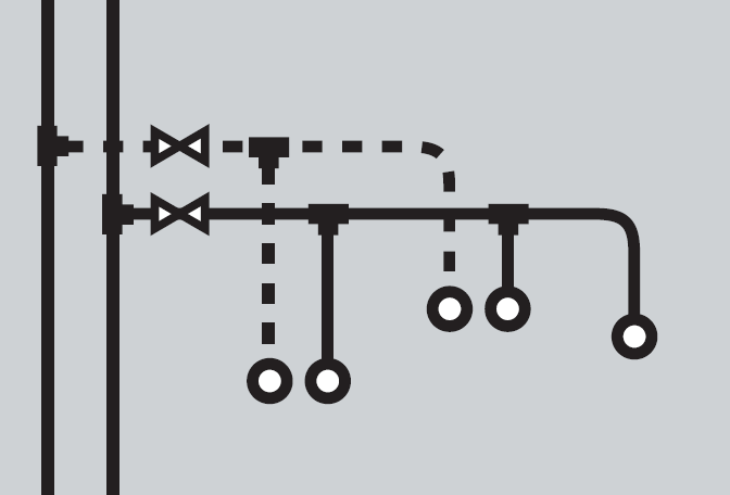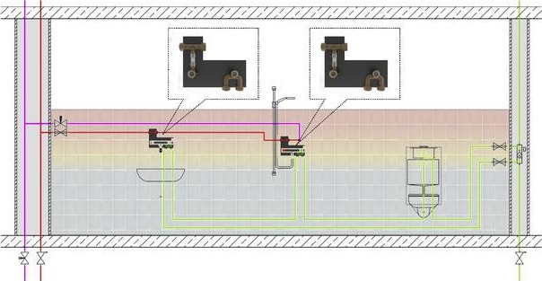 Obr. 8 Príklad optimalizácie pripojenia studenej vody a teplej vody s cirkuláciou pre nástennú armatúru: studená voda s prietokovou dvojitou nástenkou, teplá voda ako krátka odbočka [9]