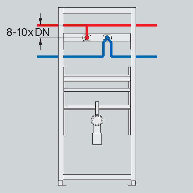 Meracie experimentálne štúdie ukazujú, že chladiace úseky s dĺžkou 8–10 × DN môžu zabrániť kritickému prenosu tepla cez armatúru do studenej pitnej vody a tým sa pri riadnej prevádzke systému zníži alebo do značnej miery odstráni opísané hygienické riziko, Obr. 7, 8. Pri systémovom riešení potrubia vodovodu a kotvenia armatúr do steny alebo predstenovej konštrukcie sú v súčasnosti na trhu aj prefabrikované hygienické boxy pre pripojenie studenej a teplej vody v zmysle hygienických požiadaviek, Obr. 9, 10. Studená voda sa privádza do dvojitej nástenky sériovým pripojením zdola, teplá voda cirkuluje v hornej časti hygienického boxu, pripojená cez jednoduchú odbočku. Potrubia studenej a cirkulujúcej teplej vody vedieme podľa možnosti v čo najväčšej vzdialenosti od seba, napr. studenú vodu nad podlahou v blízkosti kanalizácie a teplú vodu vyššie nad výtokovými armatúrami, Obr. 9c. Pri takomto riešení a pravidelnom odbere vody bez stagnácie môžeme zaručiť, že studená voda bude studená a teplá ostane teplou.