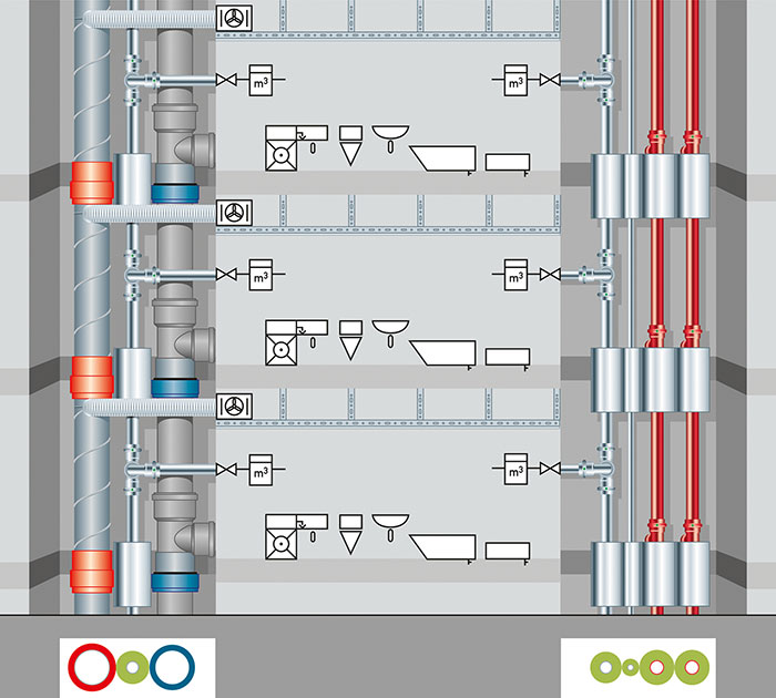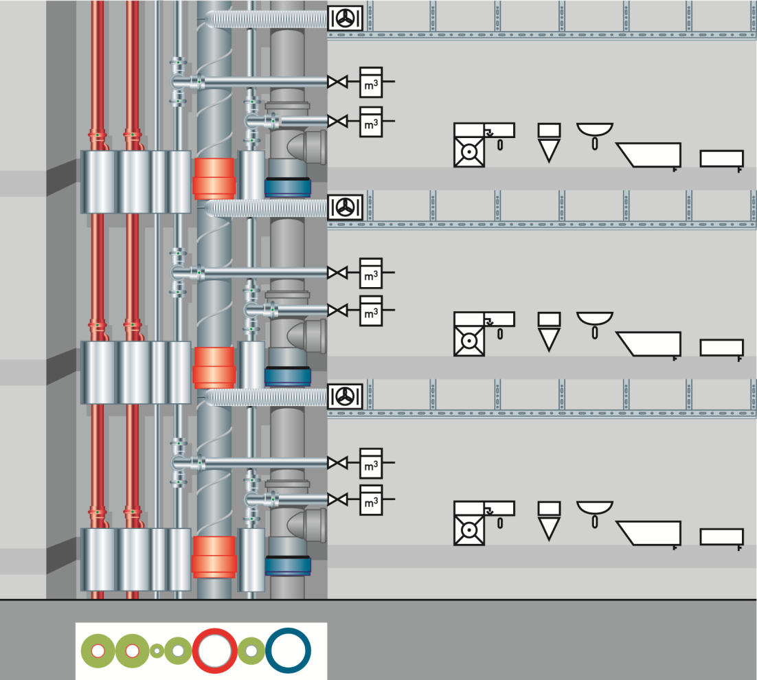 Obr. 14 Optimalizovaný stav: samostatné šachty (teplá/studená voda) chránené pred prenosom tepla a / alebo zvýšením teploty nad kritickú hranicu > 20/25 °C, ľavá šachta: odsávacie vetracie potrubie, studená pitná voda, odpadové kanalizačné potrubie; pravá šachta: potrubie TV a potrubie cirkulácie TV, prívodné a vratné potrubie vykurovania; izolácie potrubia podľa predpisov [7].