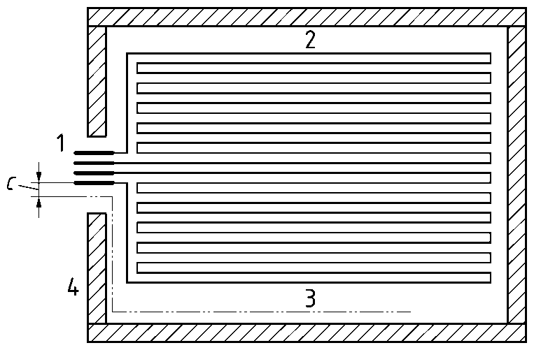Obr. 3 Potrubie pitnej vody v prípade podlahového alebo stenového vykurovania. C – minimálna vzdialenosť podľa Tab. 2. 1 – tepelná izolácia potrubí, 2 – podlahové alebo stenové vykurovanie, 3 – potrubie s pitnou vodou, 4 – stena [4]