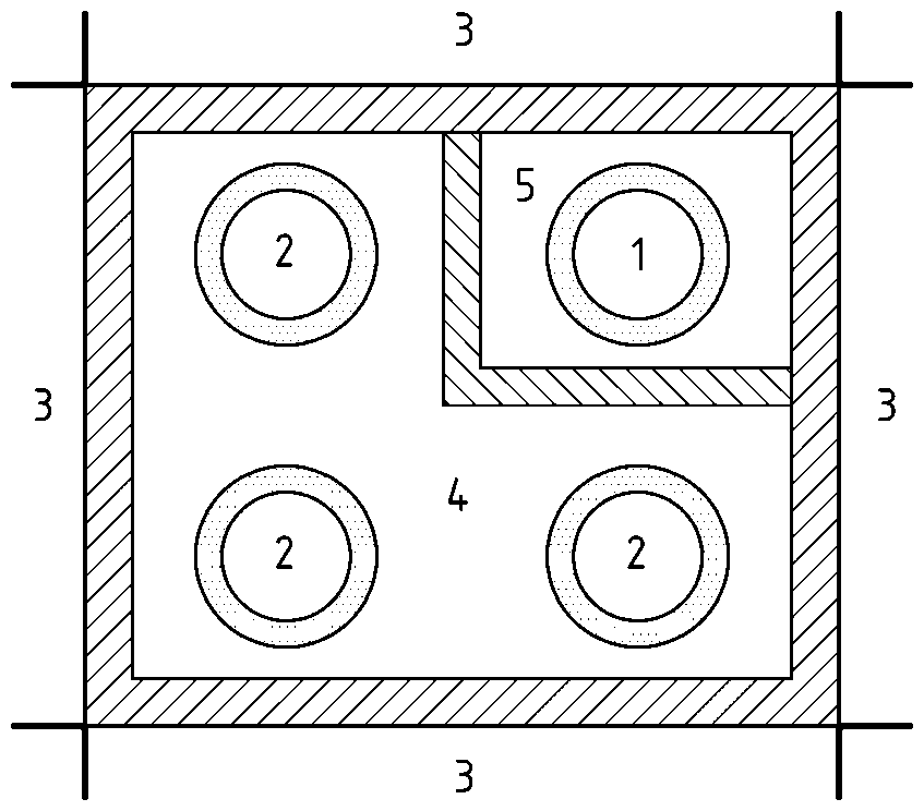 1 – potrubie pitnej vody, 2 – teplovodné potrubie, 3 – miestnosť, 4 – inštalačná šachta, 5 – oddelená „studená“ šachta [4]