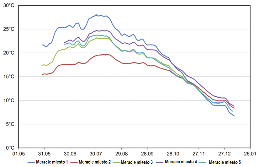 Obr. 1 Teploty prívodu studenej vody (máj až január) z 5 meracích bodov v hĺbke 1,4 m v zemi, vidiecka oblasť v južnom Nemecku (DVGW – Dr. Korth)