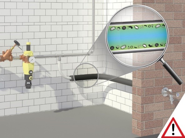 Voda v distribučnom systéme vodovodu by mala byť podľa STN EN 806-5 [1] vymenená minimálne 1-krát za týždeň. Ak sa nedá zabezpečiť výmena vody ručne, napr. pri bežnom pravidelnom odbere otváraním jednotlivých výtokových armatúr, optimálnou možnosťou je použitie automatickej preplachovacej jednotky, Obr. 6. Toto zariadenie prepláchne v nastavených intervaloch vybraný úsek vodovodu, aby bola zabezpečená pravidelná výmena vody v potrubí. Preplachovacie jednotky sú k dispozícii pre pripojenie na studenú aj na teplú vodu a inštalujú sa na konci toho úseku potrubia, ktoré sa má preplachovať vodou – napr. na konci stúpacieho potrubia alebo na konci pripájacieho potrubia vodovodu. Preplachovacie jednotky musia byť pripojené na kanalizáciu, keďže voda určená k prepláchnutiu potrubia odteká do kanalizácie (cez zápachovú uzávierku), Obr. 6.