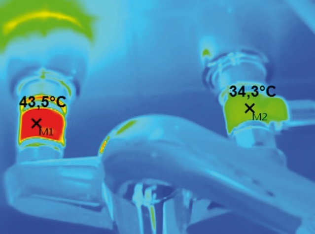 V dôsledku vyššie uvedených príčin dochádza k prehrievaniu studenej vody, ktorá už do budovy vstupuje s teplotou často nad 15 °C (Obr. 1) a počas stagnácie napr. v noci sa prehreje vo výtokovej armatúre aj „pomocou“ cirkulácie teplej vody na teplotu nad 30 °C, Obr. 2.