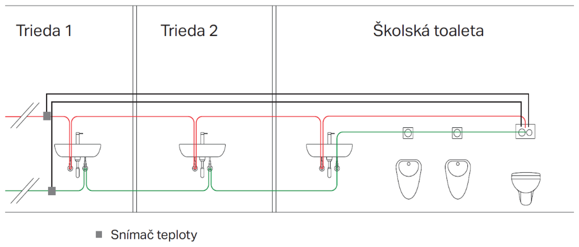 - nastavenej teploty, kedy sa prepláchnutie začne dosiahnutím kritickej teploty vody, napr. 25 °C, končí po dosiahnutí stanovenej teploty, alebo po maximálnej dobe prepláchnutia, vhodné pre technické miestnosti, inštalačné šachty, podhľady, školy a škôlky, Obr. 7,