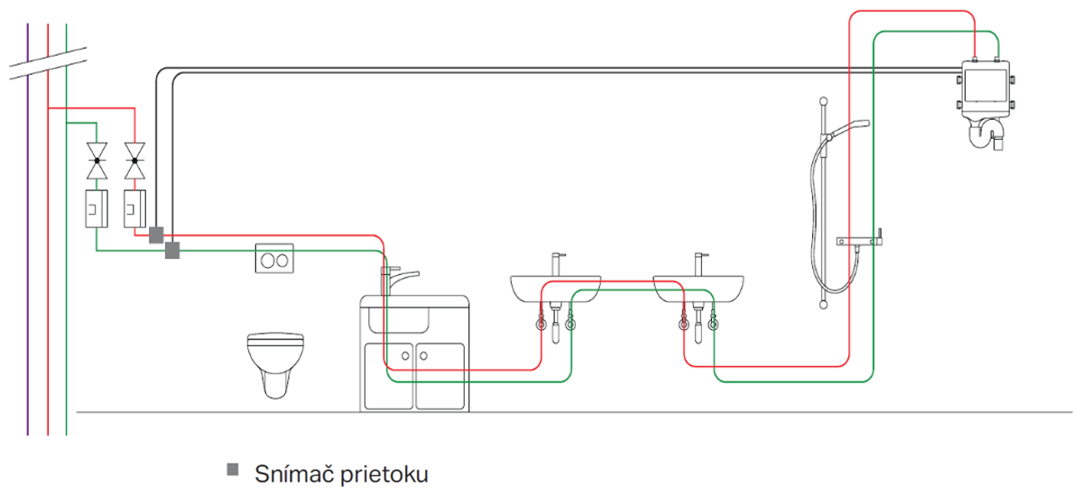 - podľa spotreby, kedy snímač prietoku pred preplachovacou jednotkou kontroluje spotrebu vody požadovanom úseku potrubia a „spustí objemovo optimalizované diferenciálne prepláchnutie“ iba takým množstvom vody, aké je nevyhnutné pre správnu prevádzku. Systém je vhodný pre školy a škôlky, obytný dom (poschodie za bytovým vodomerom), nemocnice a opatrovateľské domy, hotely, koncertné budovy, divadlá, konferenčné centrá, športové haly, Obr. 8.