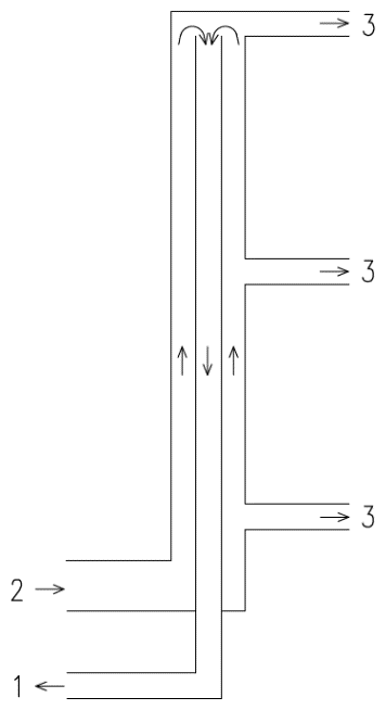 1 – cirkulačné potrubie, 2 – prívodné stúpacie potrubie, 3 – pripájacie potrubie