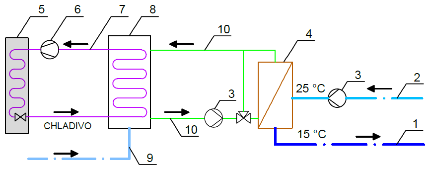 7 – primárny chladiaci okruh (chladivo), 8 – akumulačná nádoba technologickej vody,